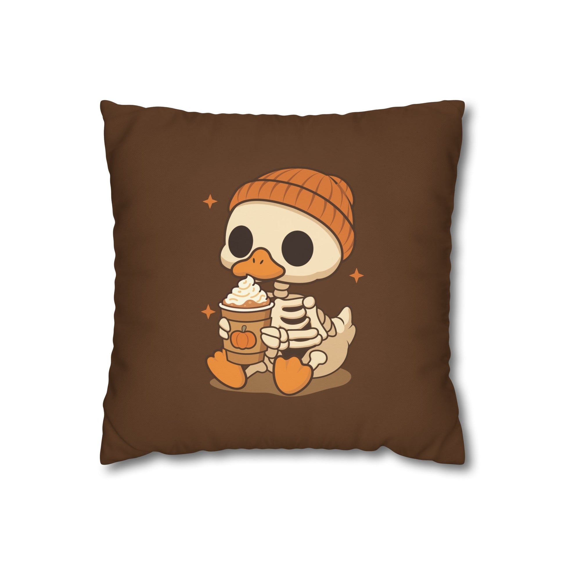 Spice up your fall decor with our Pumpkin Spice & Duck Vibes pillowcase. Featuring an irresistibly cute skeleton duck in cozy autumn gear, this square poly canvas pillowcase brings seasonal warmth with a splash of playful charm.